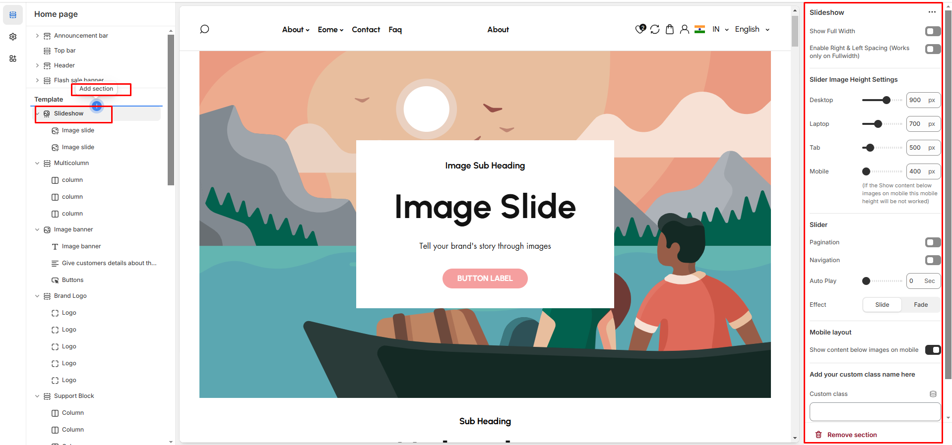 The Slideshow Section allows you to display multiple images or banners in a rotating format, making it ideal for highlighting promotions, featured products, or key brand messages.