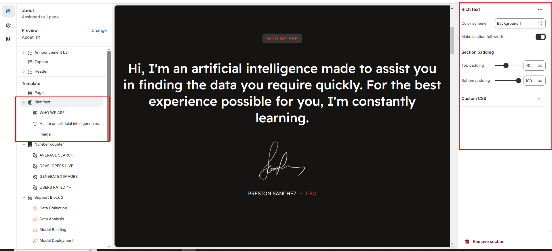 • Color scheme : You can customize the section’s appearance by changing the text color, background color, and more using preset color options.