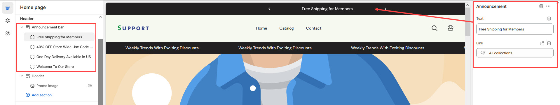 The Announcement Bar is a feature in Shopify that allows you to display important messages or promotions at the top of your store. This is a great way to catch your customers' attention with updates, offers, or news.