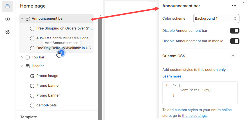 Color scheme : You can customize the section’s appearance by changing the text color, background color, and more using preset color options to the announcement bar.