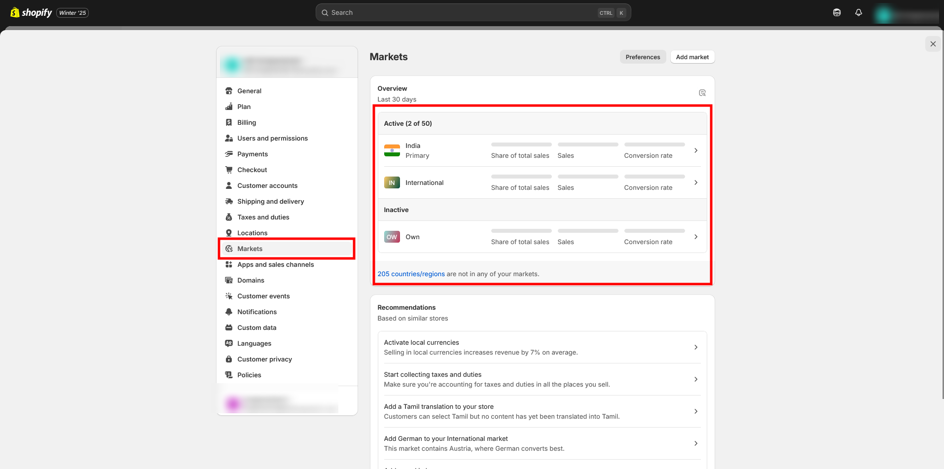 * Set up your store’s Markets under **Settings > Markets**. This defines the regions that you sell to (you would have had to do this already to set up international shipping rates).