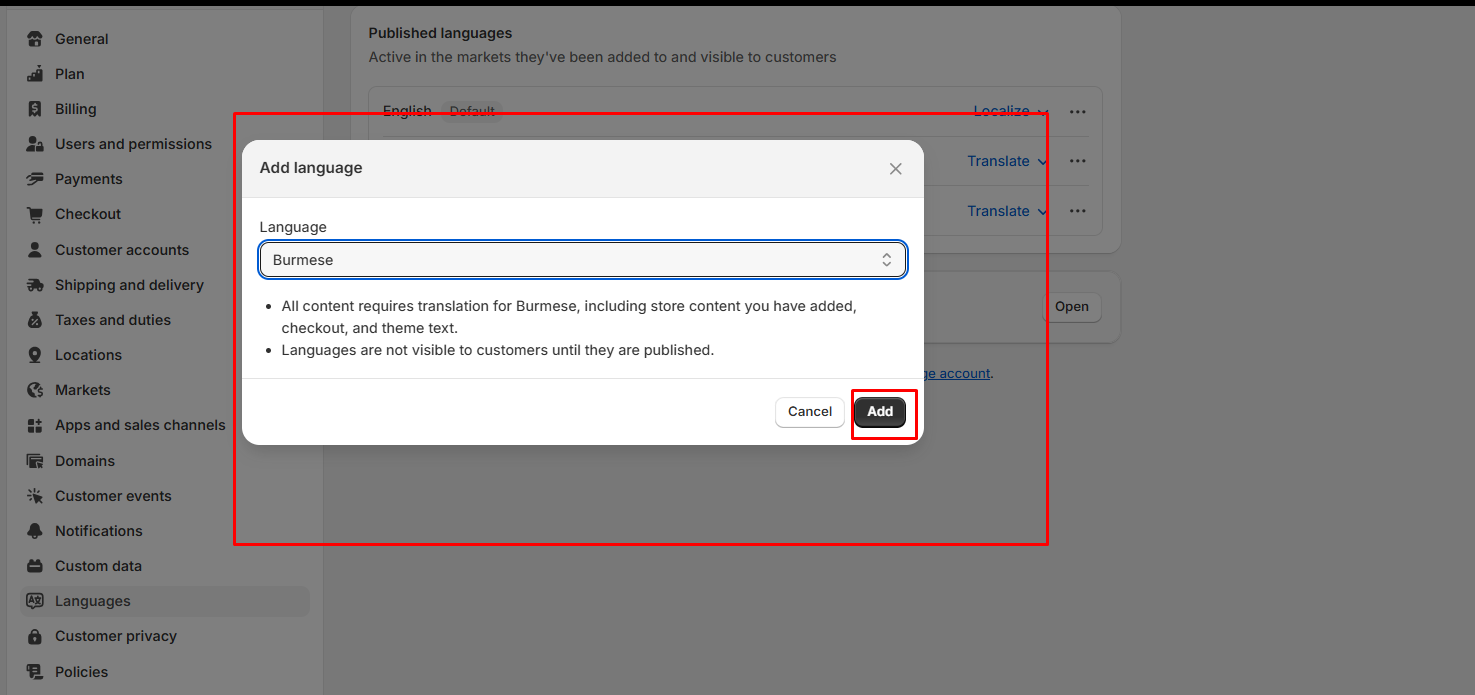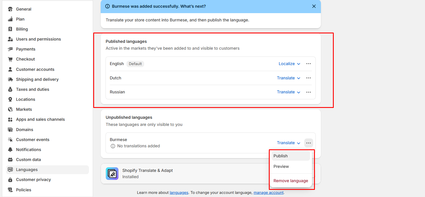 * Open **Admin store settings > Languages > Install translate & adapt app (Shopify Translate & Adapt).**