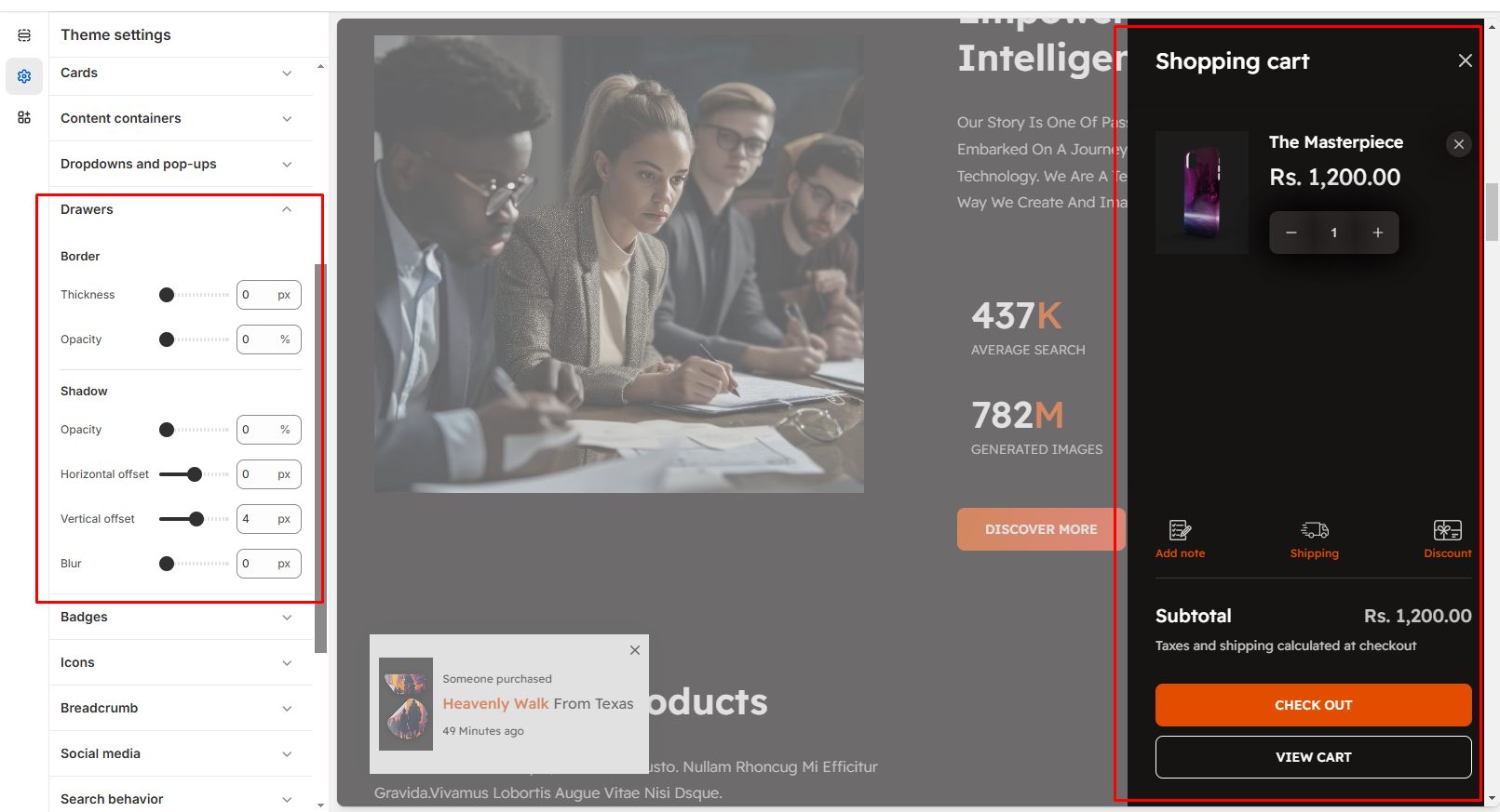 Border: Thickness (px) Defines the width of the border around the drawer Increasing the value makes the border thicker, while setting it to 0px removes the border completely. Opacity (%) Controls the transparency of the border. 100% makes the border fully visible, while 0% makes it completely transparent.