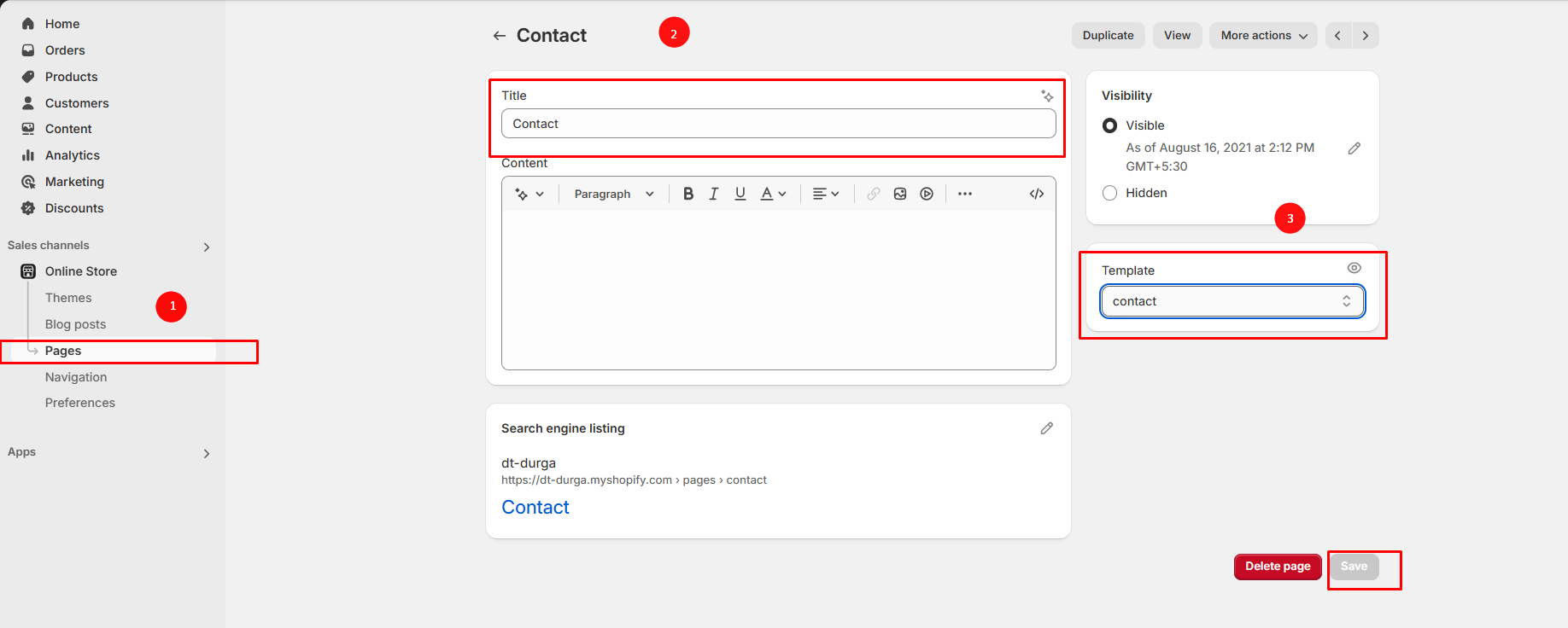 Step 4 : Select the Contact template from the Theme template drop-down menu in the Online Store section.