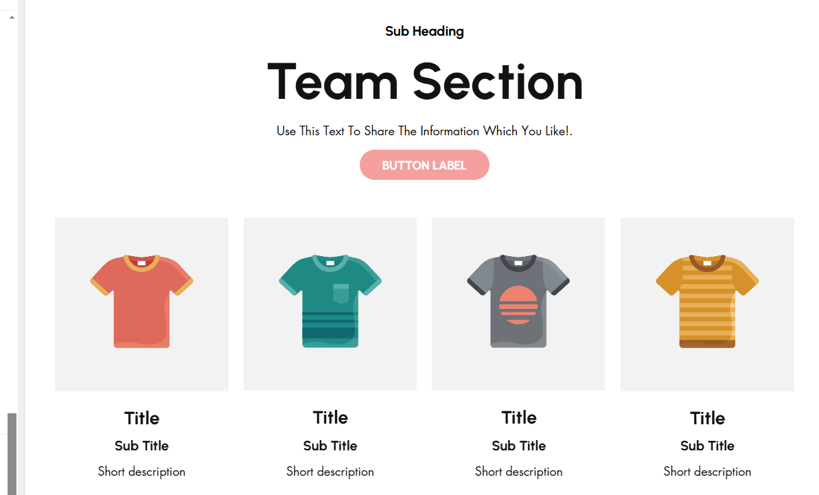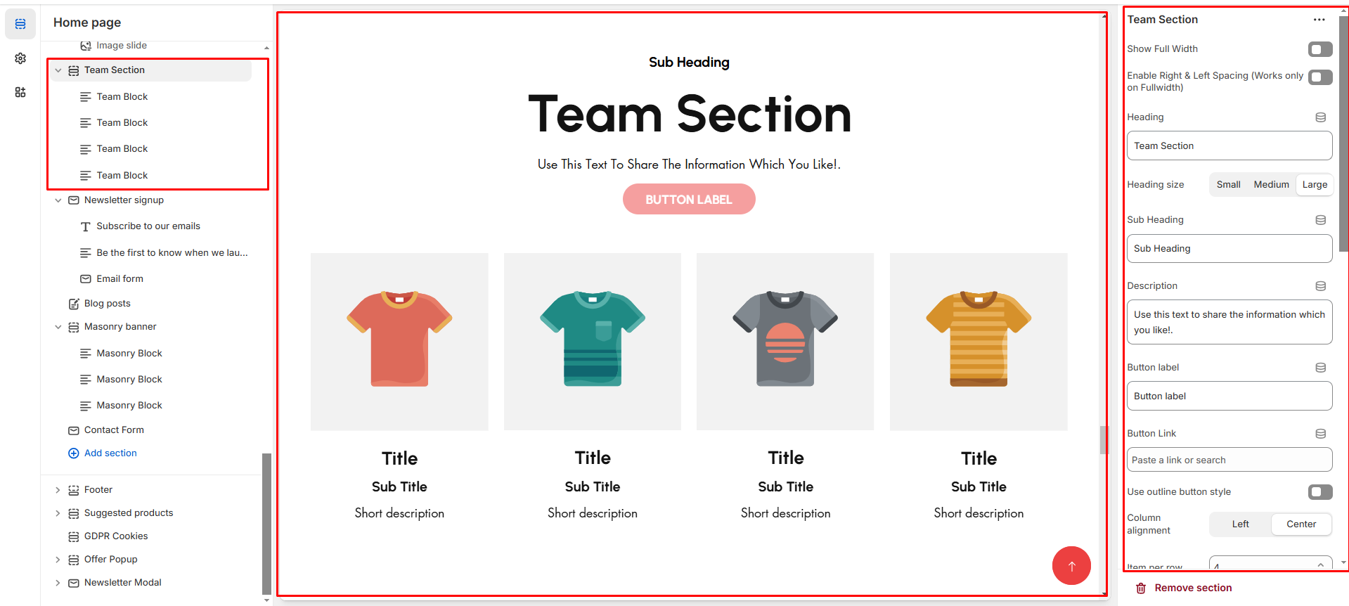 A Team Section in Shopify allows you to showcase the members of your team, adding a personal touch to your store and building trust with customers. This section typically includes photos, names, job titles, and brief bios of your team members.