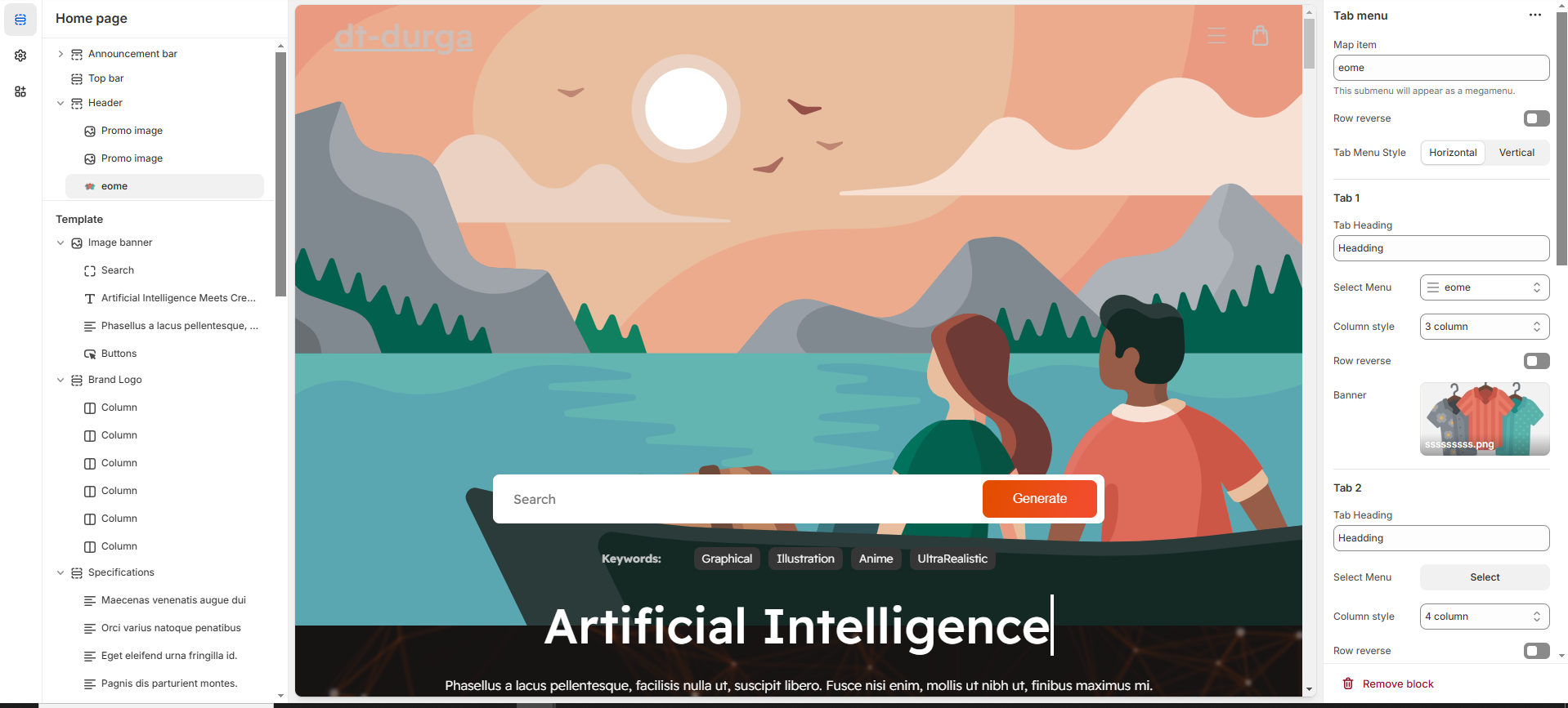 The Tab Menu Section allows you to create a megamenu with multiple tabs, each containing menus, banners, and product categories, providing a structured and visually engaging navigation experience.
